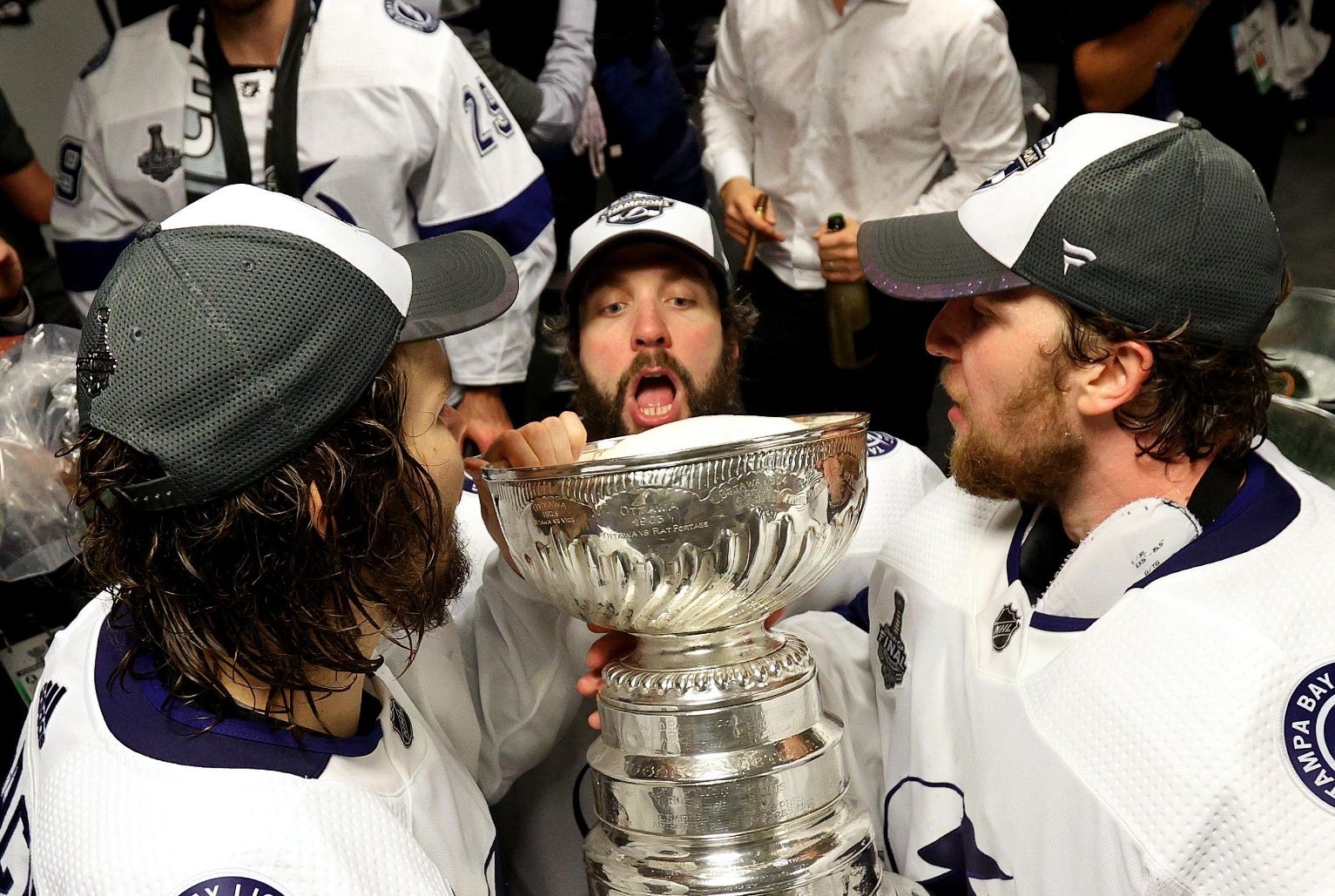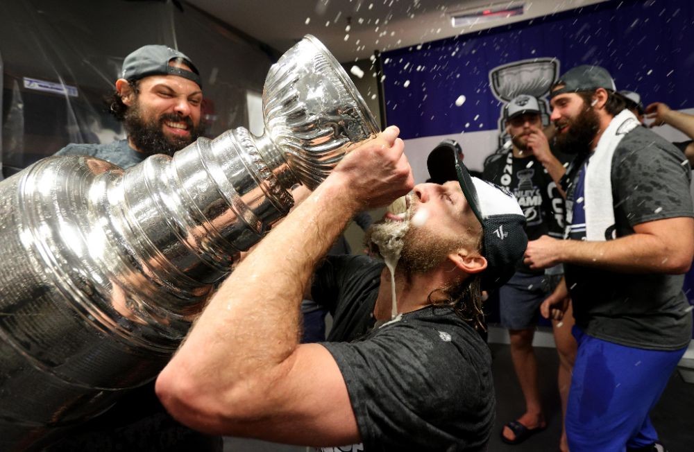 Наконец Кучеров, Хедман, Василевский и другие хоккеисты выпили шампанского из главного кубка сезона. Парни, вы заслужили.